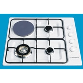 GHH18W white enamel dual fuel square cooktop with cerashield solid electric hotplate, two gas burners, wok burner with electronic ignition.