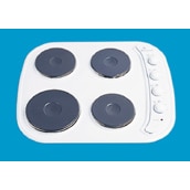 A white electric cooktop, in a square curved shape with a durable enamel surface and four cerashield hotplates.