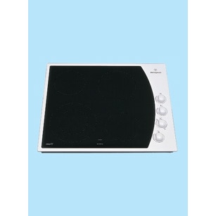 A square, ceramic cooktop with a white trim, with four quick response elements which includes one dual circuit element.