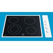 A ceramic cooktop, with a separate control panel and white trim, in a square shape with two tungsten halogen and two quick response elements.