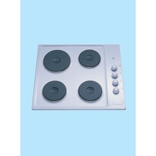 A white, square, electric cooktop with a durable enamel surface and four cerashield hotplates.