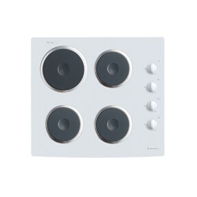 PHL266W white, square electric cooktop with a toughened glass surface and four cerashield hotplates. The edges are curved, with no trim.