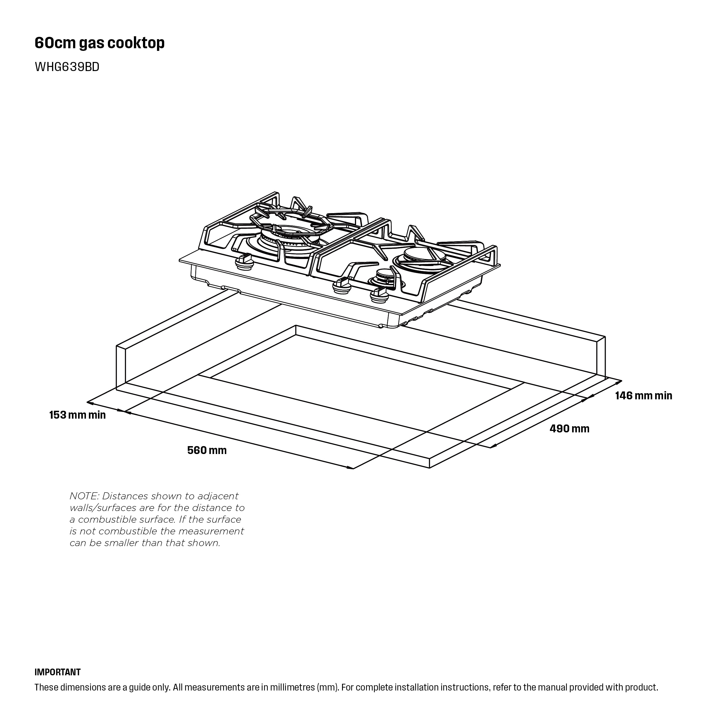 60cm 3 burner black ceramic glass gas cooktop with a high powered, intense 19 MJ/h wok burner, dual valve flame control and cast iron trivets.