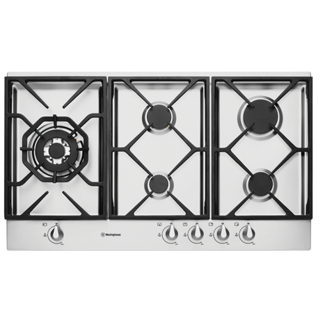 90cm stainless steel gas cooktop with FamilySafe (TM) trivets, easy ignite under knob ignition and FamilySafe (TM) flame failure device.