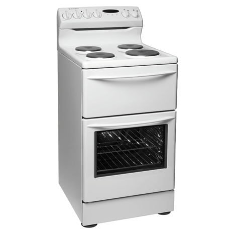 A white electric upright with fan forced oven, 540mm in width, separate grill compartment, electronic clock with programmable timer, 2 oven shelves and a solid element hob.