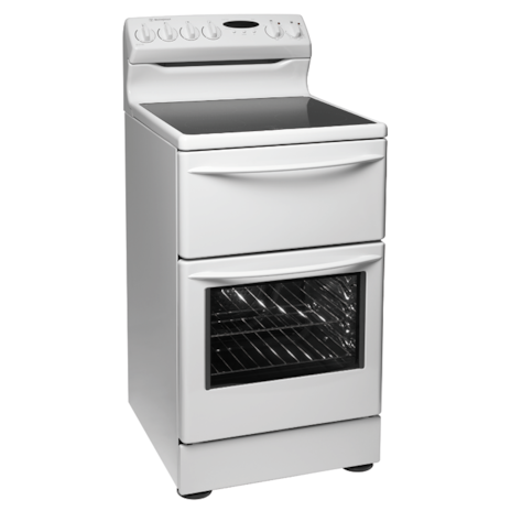 A white electric upright with fan forced oven, 540mm in width, separate grill compartment, electronic clock with programmable timer, 2 oven shelves and a ceramic glass cooking surface