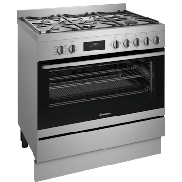 90cm stainless steel dual fuel freestanding oven with a 5 burner gas cooktop, electric multi-function 8 Twin Fan oven, 14.4 mj/h wok burner, 1 set telescopic runners, programmable timer and 125L gross capacity.