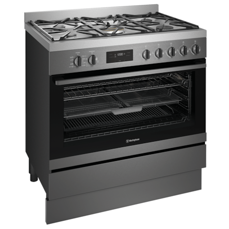 90cm dark stainless steel dual fuel freestanding oven with a 5 burner gas cooktop, electric multi-function 8 Twin Fan oven with AirFry, high powered, intense 19 mj/h wok burner with dual valve control, 1 set telescopic runners, programmable timer and 125L gross capacity.