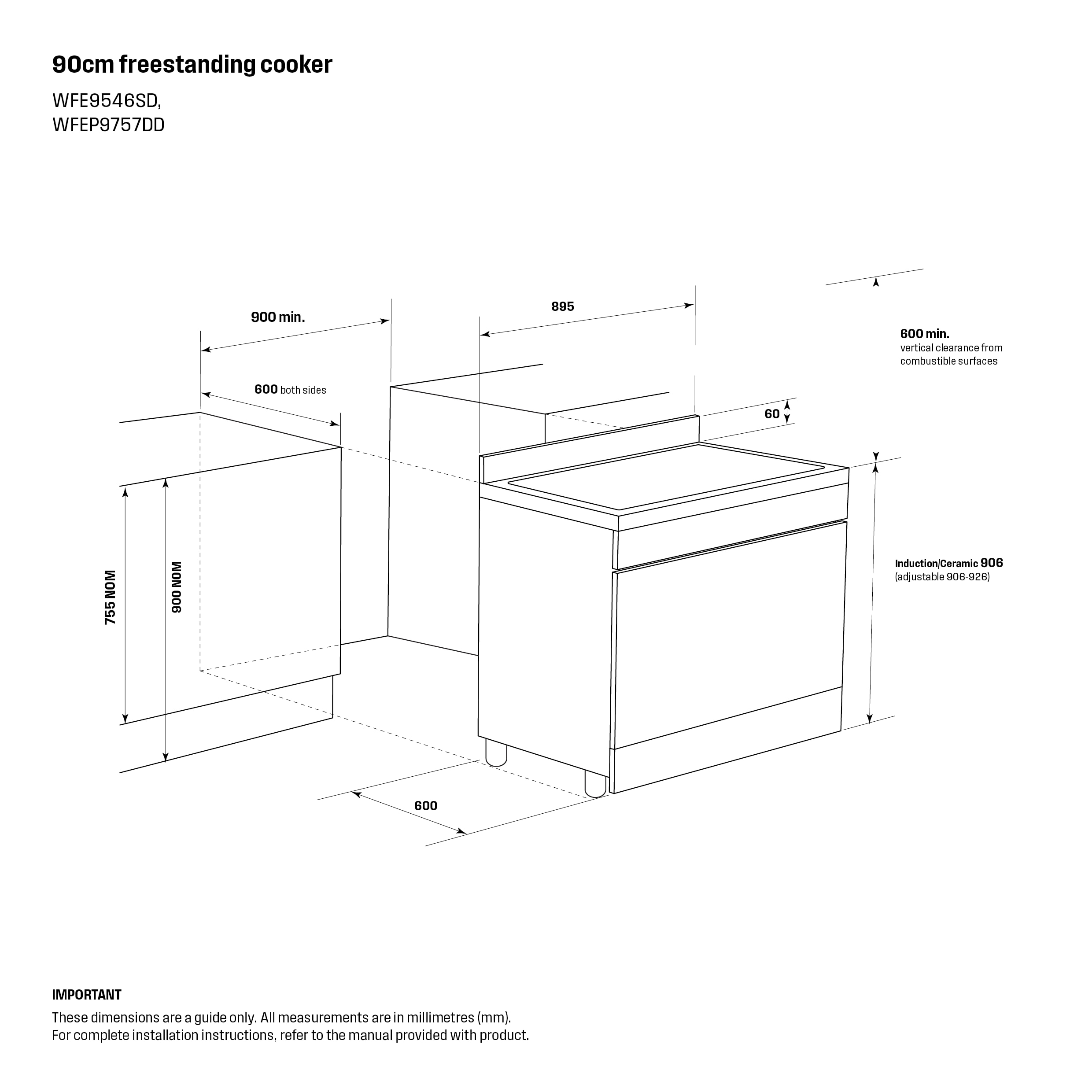 90cm electric freestanding oven with 5 zone ceramic cooktop, multi-function 8 oven, AirFry, 125L gross capacity, and Hob2Hood.