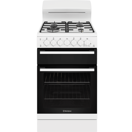 54cm white gas freestanding oven with separate gas grill, gas oven with fan bake, 60 minute timer and a 4 burner gas cooktop with 14.2 mj/hr wok burner. LP conversion kit included.