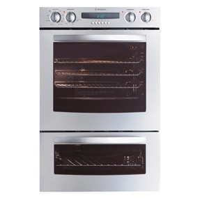 A multifunction, electric, double oven with a stainless steel finish, 8 cooking functions and 6 button programmable clock timer.
