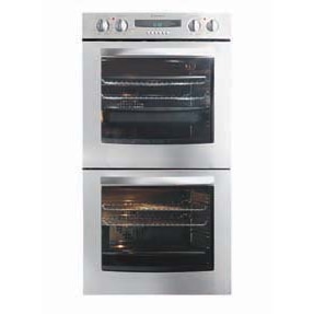 A multifunction, electric, double oven with a stainless steel finish, 8 cooking functions and 6 button programmable clock timer.