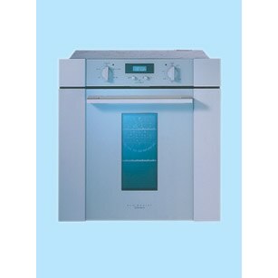 A multifunction 5 single oven with aluminium finish trims and glass control panel with an electronic cut off time of day timer with diecast control knobs and oven handle.