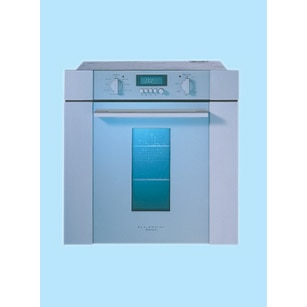 A multifunction 8 single oven with aluminium finish trims and glass control panel with an electronic programmable clock, meat probe and cast metal knobs and handle.