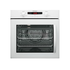 A white single multifunction electric oven, 5 cooking functions, 2 scone trays, programmable timer and side opening door.