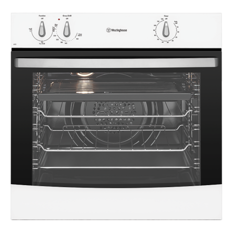 White 60cm fan forced oven with rotary controls, 80L gross capacity and 120 minute auto off timer