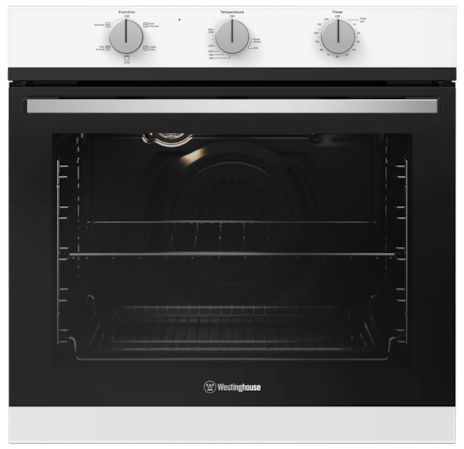 60cm multi-function 5 white oven with a 2 hour auto-off timer, knob controls and 80L gross capacity. ONLY AVAILABLE COMMERCIALLY