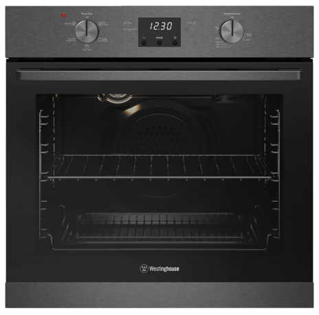 60cm multi-function 5 dark stainless steel oven with fan grill, programmable timer, and 80L gross capacity. ONLY AVAILABLE COMMERCIALLY