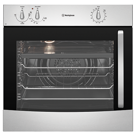 Stainless steel 60cm fan forced oven with side opening door, rotary controls, 80L gross capacity and 120 minute auto off timer