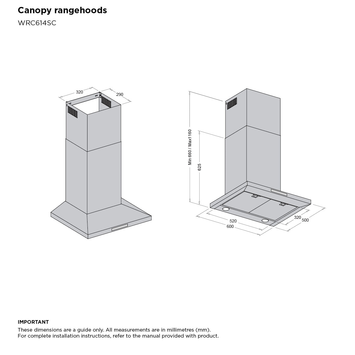 60cm stainless steel canopy hood with 840m3/h extraction, LED lighting, 3 fan speeds and dishwasher safe mesh filters.