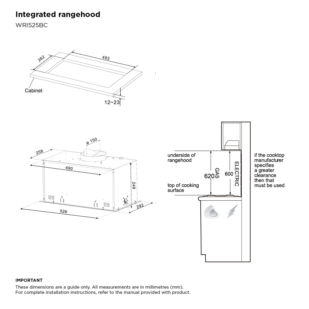 52cm integrated rangehood with Hob2Hood, 800m3/hr extraction rate, 3 fan speed plus Boost, and dishwasher safe filters.