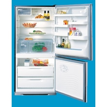 BJ503T frost free bottom mount, 500 litre refrigerator/freezer. It has a horizontal brush stainless steel, a mastermind with electronic controls and glass shelves.