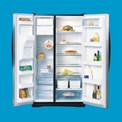 A 630 litre, side x side, frost free refrigerator/freezer with stainless steel doors and a black cabinet with ice and water maker.