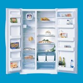 A white 650 Litre, side x side, frost free refrigerator/ freezer with multi-adjustable glass shelving, chiller compartment and crisper converta bins.