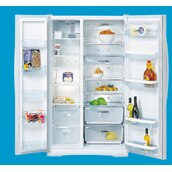 A white 660 litre, multi-flow system, side by side refrigerator/freezer with 2 fruit/vegetable crispers.