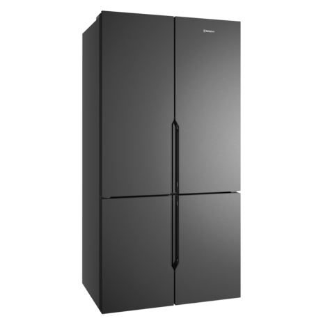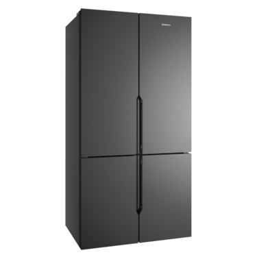 564L quad door fridge, matte charcoal black, 4-star energy, Autosense cooling technology, FreshSeal™ sealed crisper with manual humidity control and sphere ice tray.