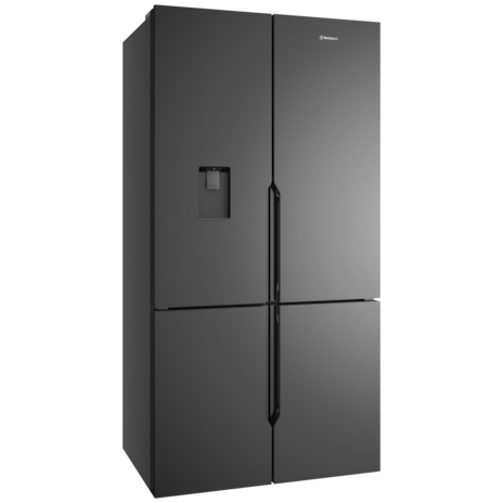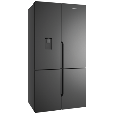 564L quad door fridge, matte charcoal black with a plumbed in-door water dispenser, 4-star energy, Autosense cooling technology, FreshSeal™ crisper with manual humidity control, Deli food compartments & automatic icemaker