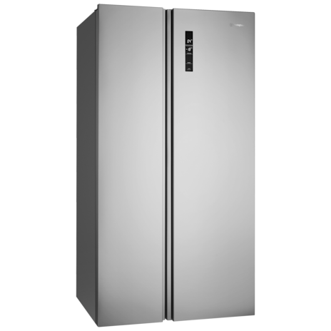 624L side by side fridge, silver with fruit & vegetable boxes, glass shelves, twist & serve icemaker, fast cooling boost and 4.5 star energy rating.
