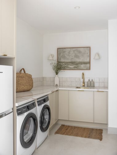 If your kitchen and laundry are close to each other or linked like in this house, keep your design flowing into each space. We did this by using similar colours, tones, lighting and appliances in both the kitchen and laundry.