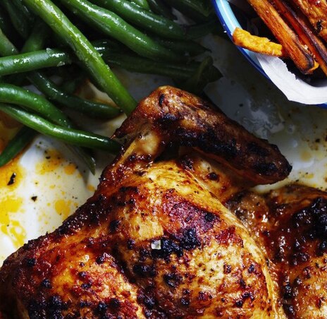 Meanwhile, cut the sweet potato skin left on in 1cm-thick fries. Arrange on a lightly greased baking tray, drizzle with remaining oil, season well with salt and pepper. After the chickens have been in the oven for 40 minutes, add sweet potato fries above the chicken and roast 15 minutes. Once chicken is out of the oven, increase the oven temperature to 230°C. Cook the fries a further 10 minutes or until golden.